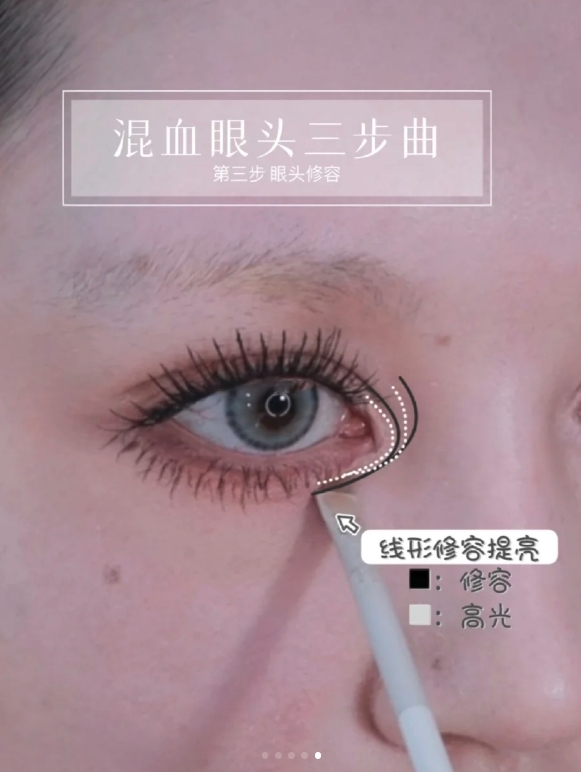 再在上下眼頭位置使用飽和度低的白色打亮筆提亮,按照下圖的白色虛線位置作打亮。再用眼影刷輕輕推開,令顏色更自然,之後再用高光粉定妝。這樣有助改變眼周的骨相,令雙眼帶有一點混血感。