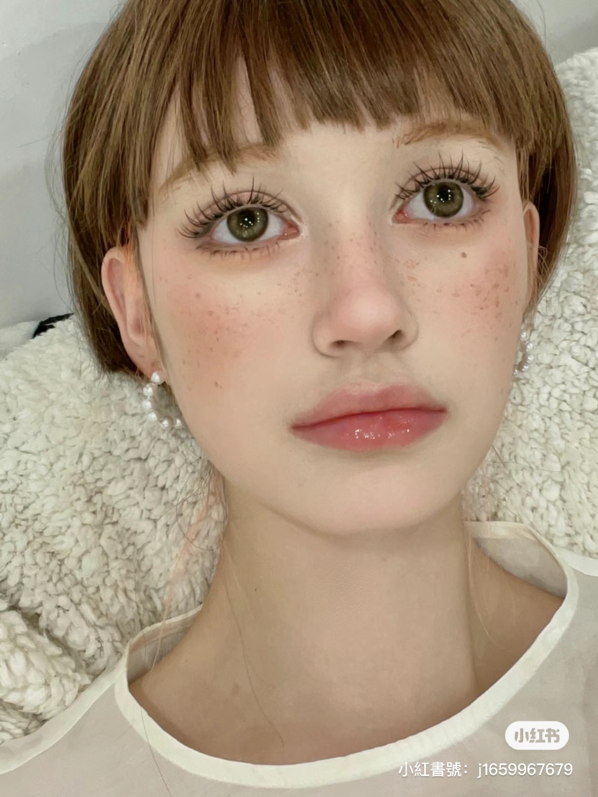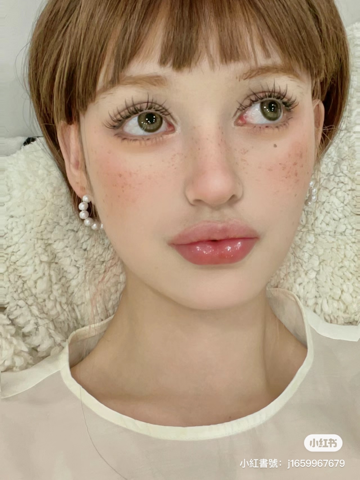 再用珠光高光點在鼻尖和山根,令臉部輪廓更立體。最後再畫上腮紅,立刻呈現少女感。