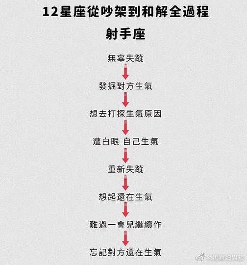 射手座吵架的時候就開始玩失蹤,就是要讓對方找不到自己。冷靜下來之後才開始找生氣的原因,想想為什麼對方生氣,想著想著連自己都嬲埋!雖然知道對方很生氣但自己也拉不下臉,直到時間久了就忘了自己為什麼要生氣對方。