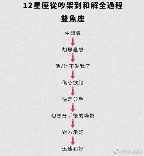 雙魚座吵架的時候先是生悶氣,然後開始腦補各種「他不愛我」,想著想著就會感到真的走到盡頭了,然後再打開WhatsApp準備同對方分手,可是又想到分手後自己會很捨不得又開始難過,而這時候只要對方一句「對不起!」,又忘了之前的所有內心戲,重新和好。