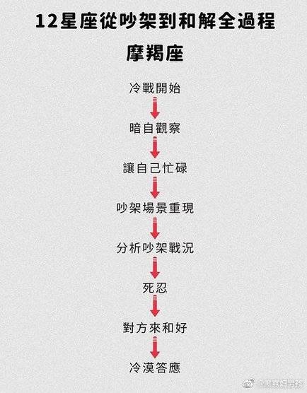 摩羯座一來就會冷戰,然後觀察對方的反應,當覺得自己想太多又開始去忙碌生活,但是腦中會不時浮現吵架場景。一番掙扎後開始分析吵架的原因。當發現自己錯了之後想和解但有冇面,唯有死忍。等到對方主動示好,一通電話來之後自己就冷漠答應。