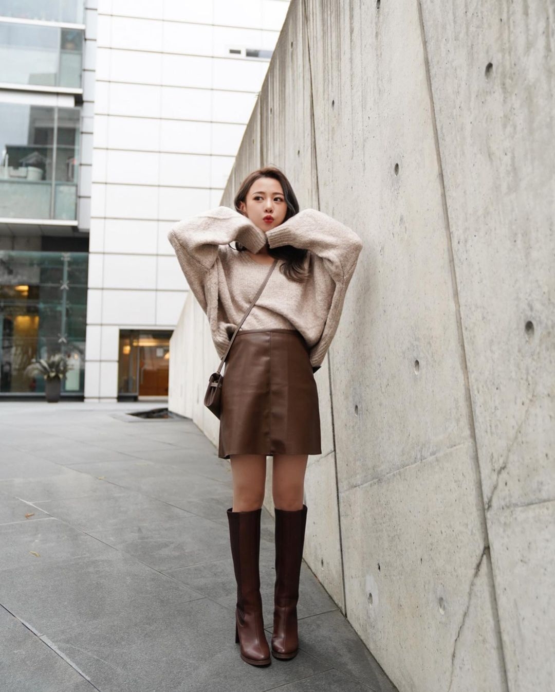 韓妹愛穿單品之一就是長靴,看上去時尚感滿滿,修飾腿型效果更是不錯~再配上一條超百搭的A字短裙或短褲,拉長比例之餘又能展現出大長腿的視覺效果,連屁股和大腿的小肥肉都遮住,充滿青春活力感!韓國的小個子女星IU、Yeri也會這樣搭配!