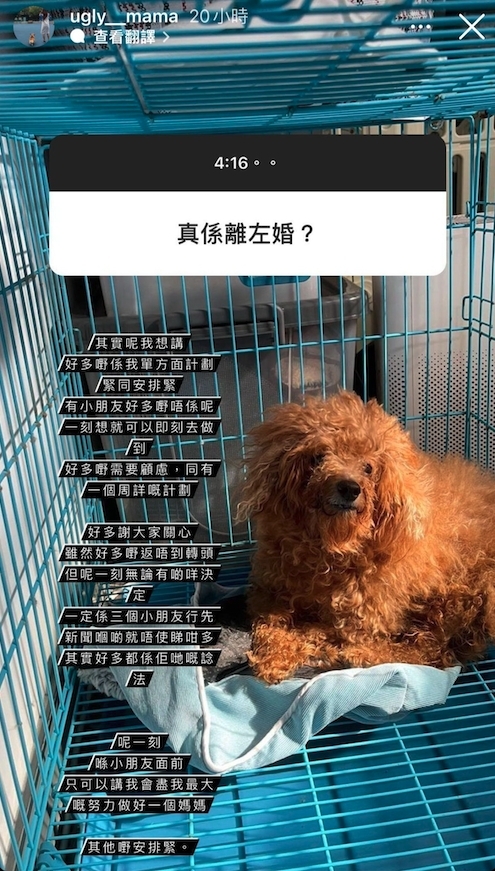 自從雯雯早前在IG Story疑似正式發表離婚宣言,不少網民都好奇雯雯是否真的打算離婚,而恰巧雯雯之後就在IG上與網民大玩「你問我答」,其中就有網民問到「真係離咗婚?」,雯雯回覆稱:「其實呢我想講好多嘢係我單方面計劃緊同安排緊,有小朋友好多嘢唔係呢一刻想就可以即刻去做到,好多嘢需要顧慮,同有一個周詳嘅計劃。」
