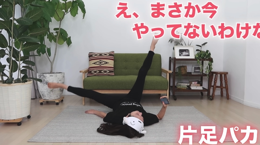 第一個動作先躺在瑜伽墊上,然後舉起雙腳,之後將雙腳開合30秒,雙腳可以張開到最大的幅度,會感受到大腿有明顯的拉扯感覺,大家可以一邊玩手機一邊做運動,懶人必學動作!