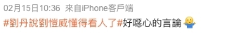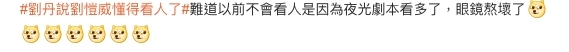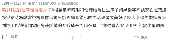劉丹更疑以5字暗串前媳婦楊冪:「(劉愷威)懂得看人了」外界因劉丹這句掀起熱議,不少人覺得劉丹太小氣,楊冪離婚後從來沒有說過男方家人的不是,婚姻期間就連劉愷威自己也說過楊冪像「保母」,家庭與工作都要兼顧。有網民指責劉愷威一直躲在父親的背後,有什麼都由劉丹幫兒子發聲,讓人感到無語。