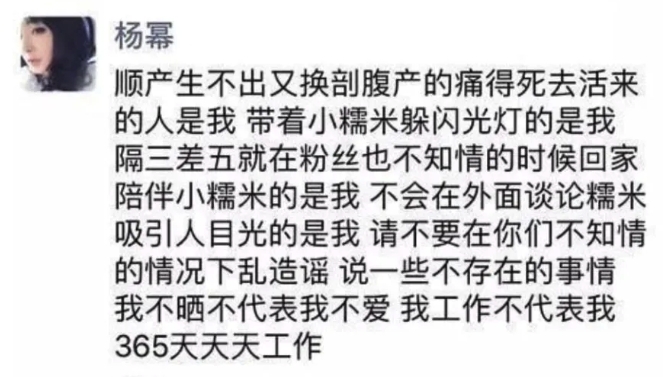 離婚後,不少網友都質疑長期居住內地的她,是否將小糯米留在香港男方家就不管不顧。當時就流出了楊冪在私人帳號的斥責,她強調外人根本不明白她對於小糯米的愛:「順產生不出又換剖腹產的,痛得死去活來的人是我!帶著小糯米躲閃光燈的是我!」指自己只是為了保護女兒,選擇每次秘密回家見小糯米,也不會在外面談論育兒,希望外人不要再造謠自己而女兒的愛!不少網友都覺得楊冪只是低調,其實一直有陪著女兒成長。