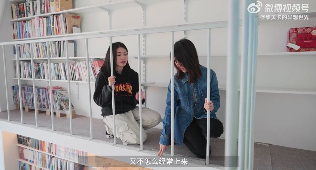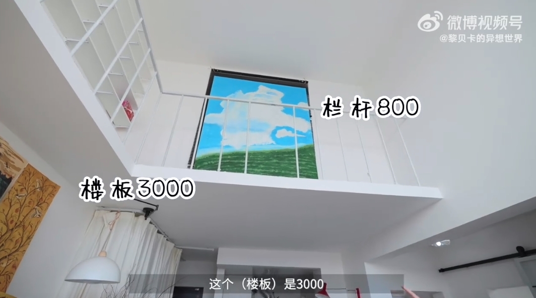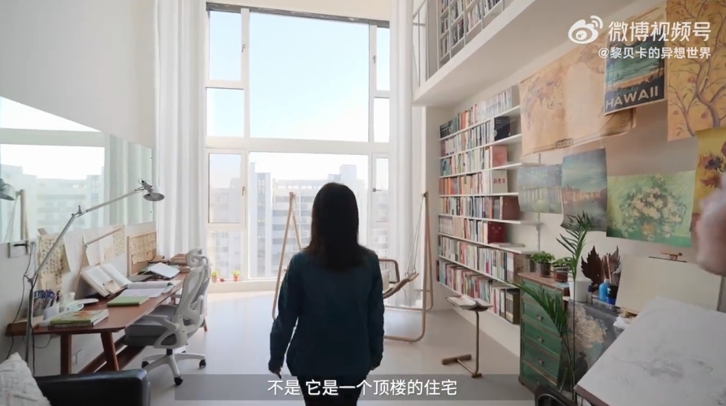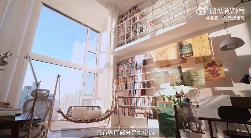 影片中介紹到番茄的房子是位於頂樓住宅,所以客廳的樓底超高,看上去空間感十足。原來房子由她自己一手一腳設計,2樓的空間主要用來儲物,她為了節省7千人民幣的安裝樓梯費用,每日都要抬著大梯子走上走落,2樓的地板石屎也是由裝修師傅在空地找建材垃圾而鋪成。