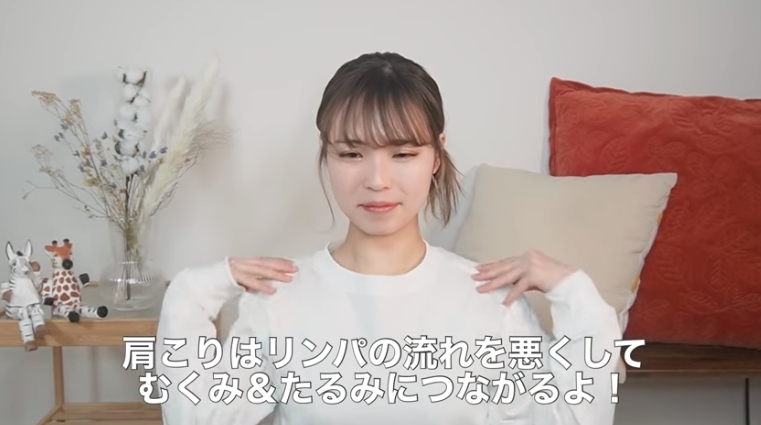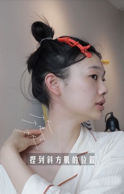 之後大家可以按壓斜方肌的位置,從脖子一直按下去肩膀,也可以用捏的方法,左右邊各捏10次就可以。然後再用食指和中指去按鎖骨上方,同樣是左右邊各10次。
