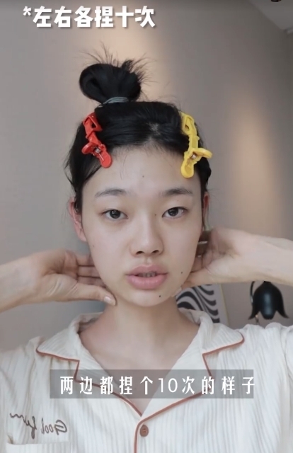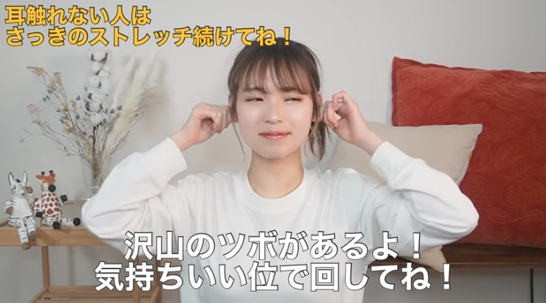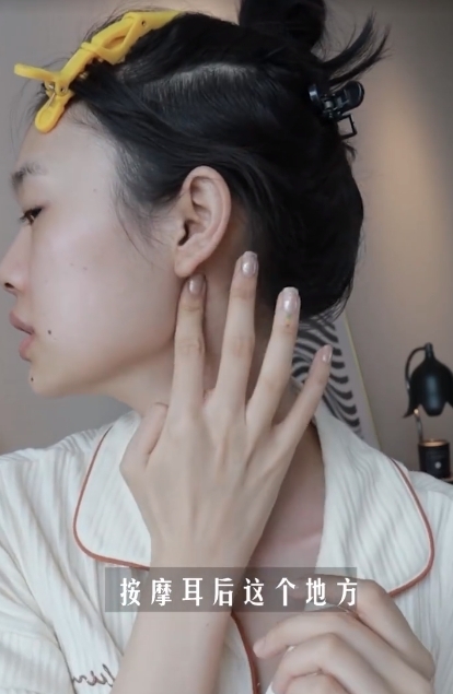 首先博主會用食指及中指去按摩耳後位置,按大約10秒左右,之後再輕輕捏一下耳朵,因為耳朵也有很多穴位,所以大家平時也可以多多捏耳朵。