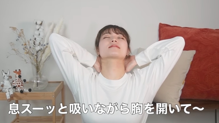 第七個動作雙手往後交叉扶著後頸,將頭向後仰並停留10秒,向前亦停留10秒,要感受到肩膀是打開的狀態。