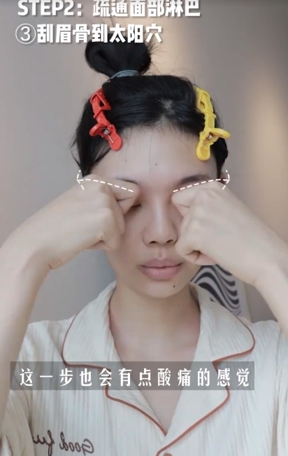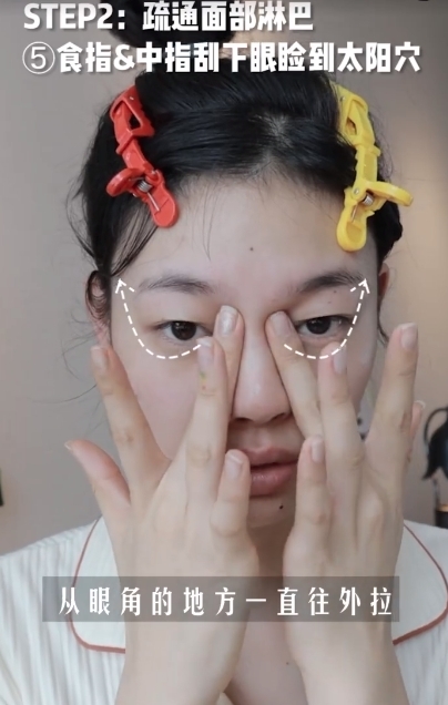 第五個動作是用無名指去刮上眼皮到太陽穴,做大約10次左右,由於無名指的力度最輕,不會太大力拉扯到皮膚。之後再用食指及中指刮下眼皮位置,從下眼皮拉到太陽穴,有效可以去眼皮水腫!