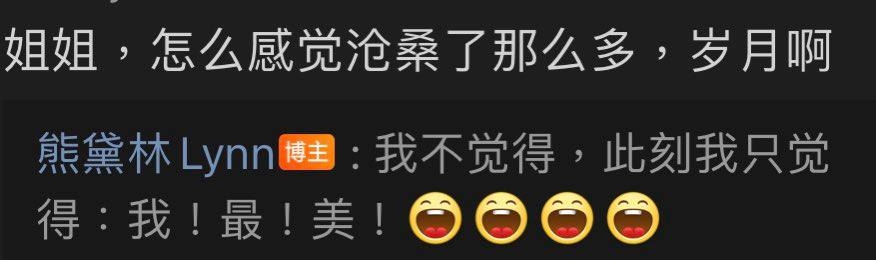 不過有部分網友在網上卻留言道:「怎麼感覺滄桑了那麼多,歲月啊」,暗指熊黛林已經不如往年。對於網友的留言,熊黛林並沒有默不作聲,反而是選擇反擊!她在留言區回覆:「我不覺得,此刻我只覺得:我!最!美!」,自信的回應網友的攻擊。