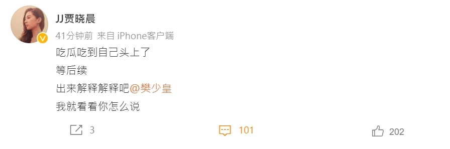 其後JJ也親自回應:「吃瓜吃到自己頭上了,等後續,出來解釋解釋吧@樊少皇,我就看看你怎麼說!」能看出就連妻子JJ本人也毫無防備就「被離婚」。不過JJ要求丈夫樊少皇解釋的帖文語氣貌似有著幾分調侃,因此有不少網友猜測或許樊少皇是真的不小心打錯了,夫妻感情並沒有問題!
