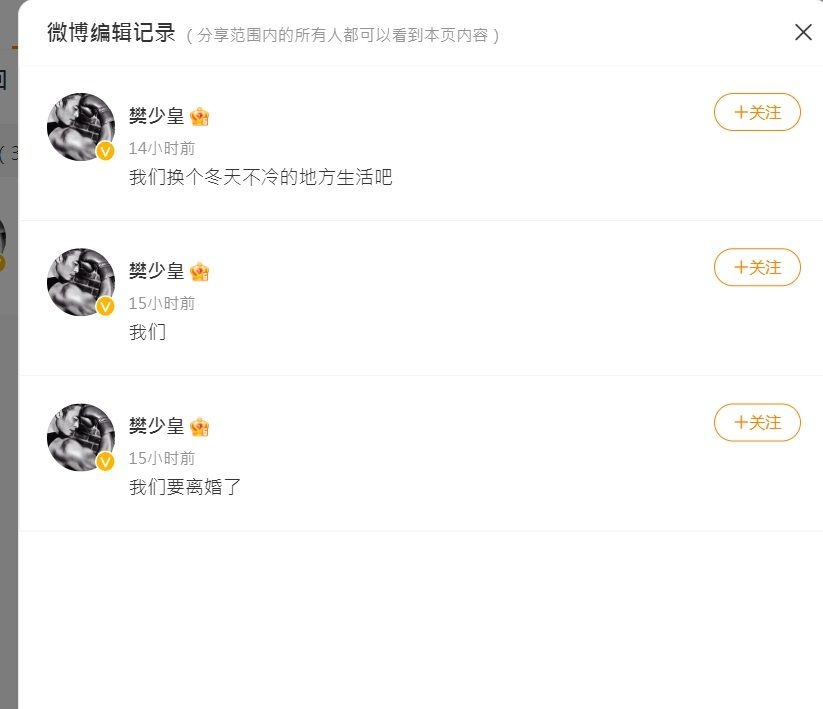 樊少皇與JJ賈曉晨結婚七年,今早JJ發文慶祝週年紀念,怎料樊少皇居然突然宣布離婚:「我們要離婚了」震撼不少網友。其後雖然樊少皇編輯內容:「我們換個冬天不冷的地方生活吧」但由於兩次的內容無論是字數還是含義,都完全不一樣,所以有很多網友無法相信是打錯字,質疑難道是在透露感情出現問題?