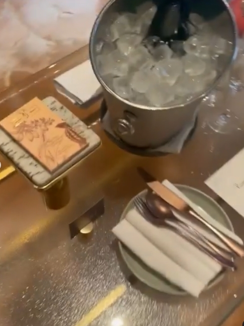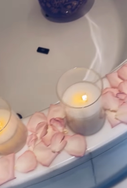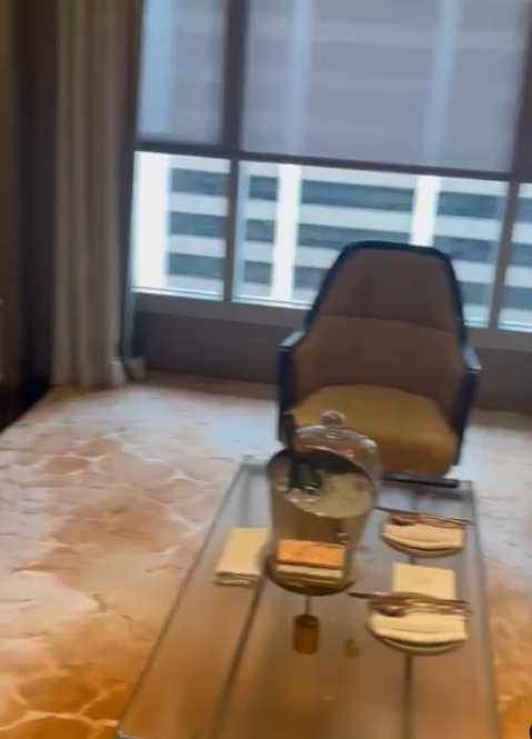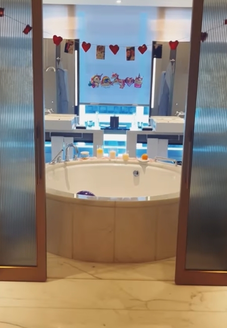 其後靚湯更大曬房中擺設,不止有超大圓形浴缸,還有客廳、飯廳、臥室還有豪華雙人床,應該是該酒店所提供的「尊貴客房」,相當漂亮。桌上還拍到有蛋糕、酒,房間中更有不少驚喜佈置,超級Sweet!