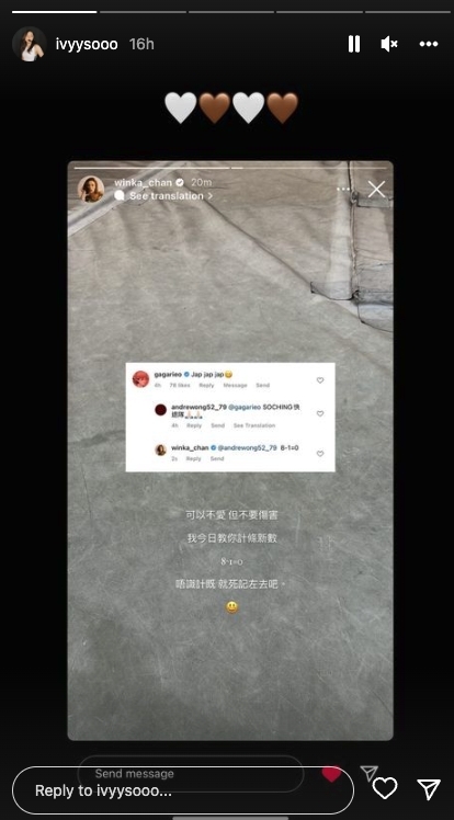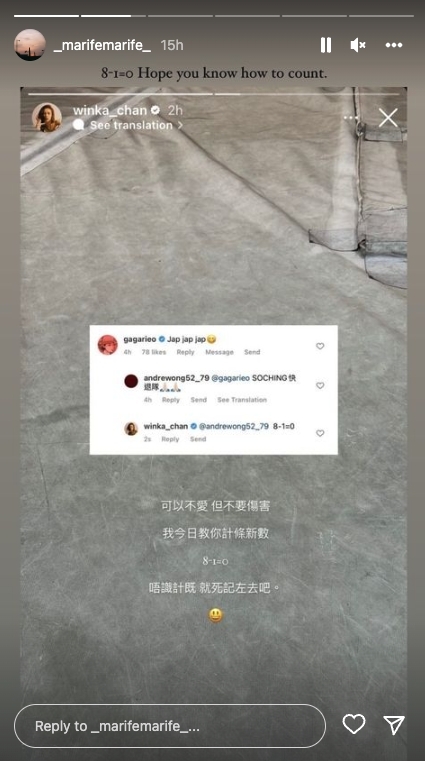 近日,就有網民在Winka帖文下,對Collar隊長阿Gao(沈貞巧)的留言:「Jap Jap Jap」回覆:「So Ching快退團」,而So Ching隊中好友Winka就回應該位網民留言:「8-1=0」,並在IG Story轉發留言,又寫上:「可以不愛 但不要傷害 」,「我今日教你條新數」,「8-1=0」,明言「唔識計既 就死記左去吧。」