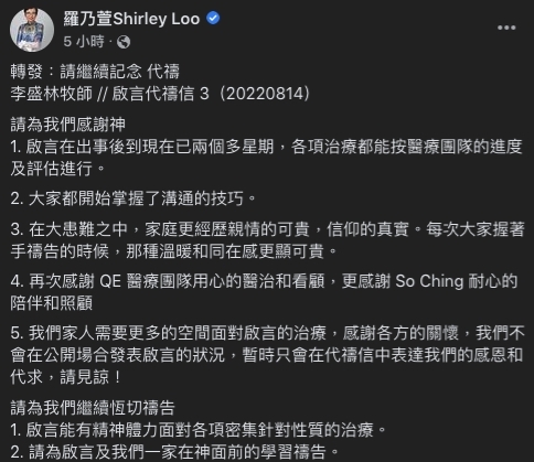 阿Mo爸爸亦先後出了3次禱告文,其中有兩次都點名多謝So Ching對阿Mo的支持,最近一次在8月14日,他說:「感謝So Ching耐心的陪伴和照顧」,可見,這段時間So Ching一直專注照顧男友阿Mo。