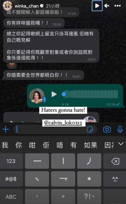 反駁網民後的Winka隨後更貼出與前度的對話,前度暖心安慰被質疑的她,表示網民有自己的見解無須太介意:「你唔需要全世界都明白你!」之後經理人和弟弟的安慰,也令Winka覺得很感動。也有不少粉絲留言,表示會繼續支持Winka,讓她無須理其他Haters的聲音。