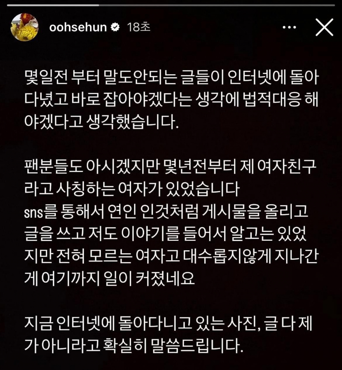 世勳本人也在IG上發文表示:「從幾天前開始網上流傳著不像話的文字,出於要糾正的想法,我想要採取法律措施。粉絲們也知道,幾年前開始有個女人謊稱是我的女朋友,在社交媒體上假裝是我的女朋友,上傳文章?我也是聽了故事才知道的,但是一個完全不認識的女人,於是沒把這件事當一回事,如今事情發展到現在這樣。我明確地告訴大家,現在網上流傳的照片和文章都不是我」