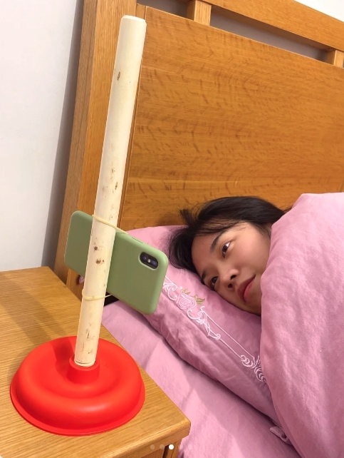 他又想到利用馬桶塞製出手機支架,以後女友不論是坐著還是躺著都可以很輕鬆地追劇!這位男友更表示女友以前都是凌晨一點睡覺,但自從有了這款手機支架後,就變成天天凌晨兩、三點才睡,這都是男友的功勞啊!