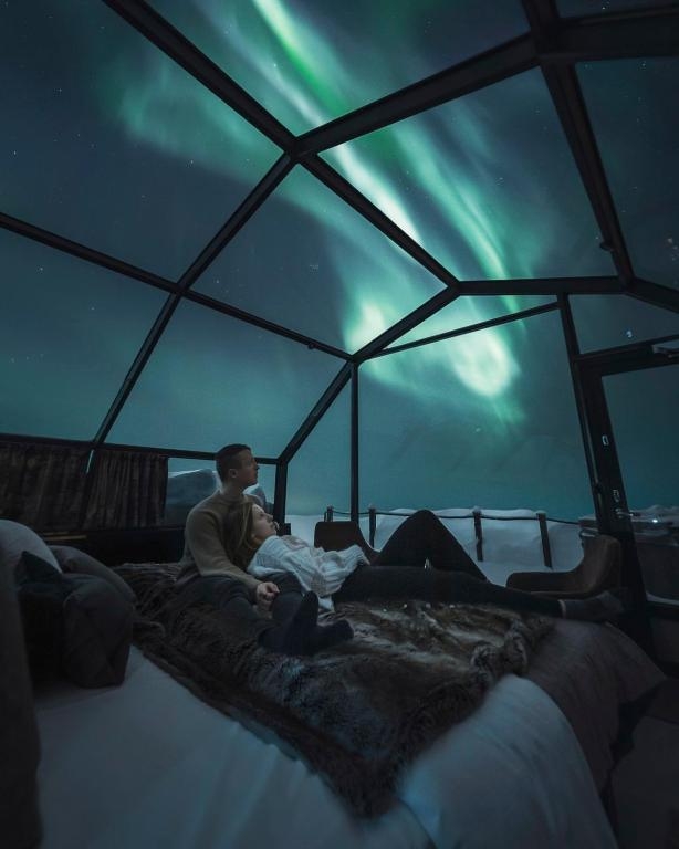 這間酒店位於芬蘭,在烏蘇瓦拉山的山頂,整間獨立屋子全玻璃設計,客人能夠坐在玻璃屋中欣賞周圍壯麗的景色!若是運氣好的話,更可以欣賞到超唯美的極光表演,酒店在房間外部設有按摩池,客人可以在冰天雪地中享受溫暖的泡浴。就算不是冬天到訪,這件酒店被大自然環抱著,一年四季的景色各有特色,非常好看!被不少網民封為一生人一定要住一次的聖地~