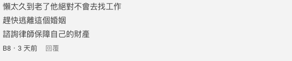 在各種的壓力與失望下,女網友有了離婚的念頭:「錢是我在賺、平常家務我也有做,那我需要這個老公幹嘛?」丈夫則是反駁到他當全職爸爸也不容易,甚至指離婚也沒問題,但要將一半身家分給他。女網民說這幾年自己什麼都不捨得買,但丈夫就以顧家辛苦為由買手錶、出國玩,自己也滿足了,現在離婚還要被威脅,因此不知道該怎麼辦。