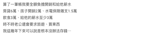 以台幣來計算,女網友每個月需要給6萬房貸、2萬是孩子的開銷、生活雜費1.5萬、餐費3萬,還要另外給至少3萬台幣丈夫當作薪水。女網友表示老公還時不時要求買東西、旅遊等,就算現在孩子已經小學二年級,還是會找理由不去找工作,而女網友也感到壓力很大!