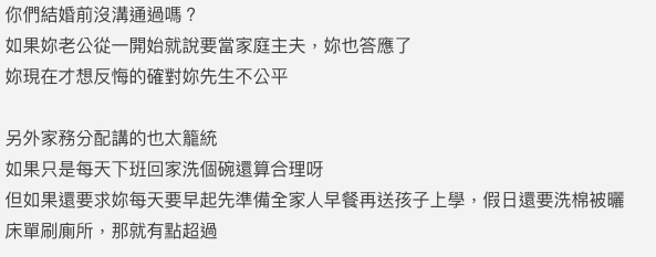 因為孩子已經長大,白天大部分時間都在學校,加上女網友感到壓力很大,有多次勸說丈夫找工作回到職場,但都被丈夫用各種理由拒絕,例如怕小孩有特殊狀況等。後來丈夫在再三要求下說,以前照顧小孩沒能休息,現在想休息一下,一年後又說:「他(丈夫)已經離開職場7年了,找不到什麼好工作,要他回去上班對他不公平!」