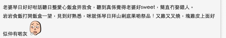 結果在公司打開飯盒一看,才發現裡面的菜色非常眼熟,雞、叉燒,相當豐富。港男思考後才記起,那些都是前一天一起去拜祭後剩下的祭品,甚至還看到雞皮上面沾有香灰。港男立刻感到很失望,本來以為妻子貼心準備愛心飯盒,結果原來只是不想浪費,想他幫忙吃了。