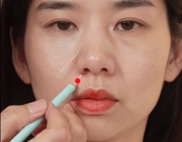 然後同樣拿出化妝掃進行填充和暈染開,之後利用化妝掃再把三角形輕輕地向邊緣過渡一下,就會瞬間發現法令紋不見了,而鼻翼也收窄了,就連凸嘴也會有明顯改善!