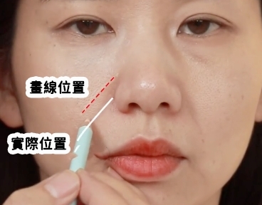 先在淚溝起點處畫一條直線,畫到終點處。再從淚溝起點處沿著鼻背向下畫一條直線,然後再連接到淚溝終點處,形成一個直角三角形。