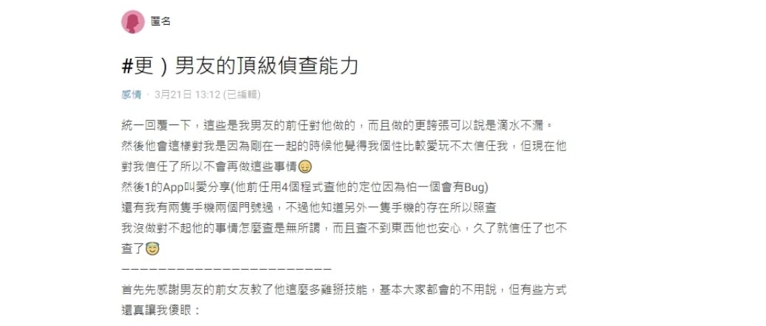 情侶之間應互相信任、給彼此足夠的空間,若是逼得太緊,反而會弄巧成拙,將對方嚇跑。但隨著科技發達,除了有交友app可以結識朋友外,連Carousell都能成為「出軌神器」,這也讓大家不得不靠一些「手段」來建立自身安全感。近日一名台灣女生於Dcard以「男友的頂級偵查能力」為題發文,並分享了5招防出軌妙招!網民看了紛紛直呼方法太高招:「傻眼!」