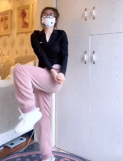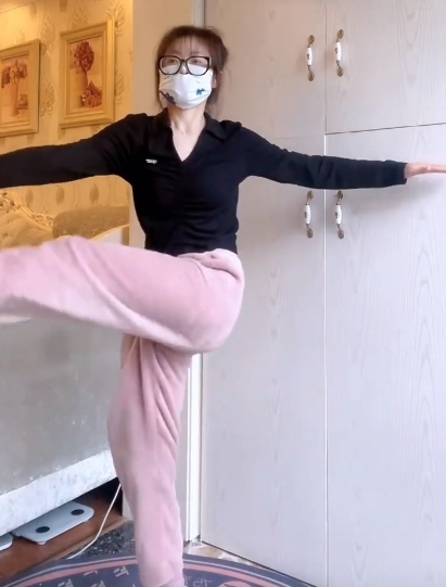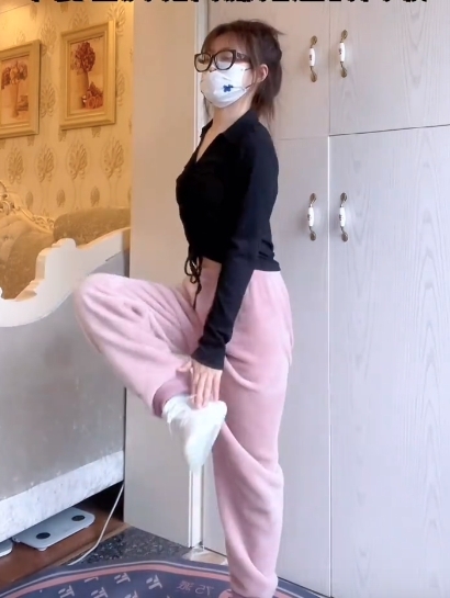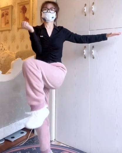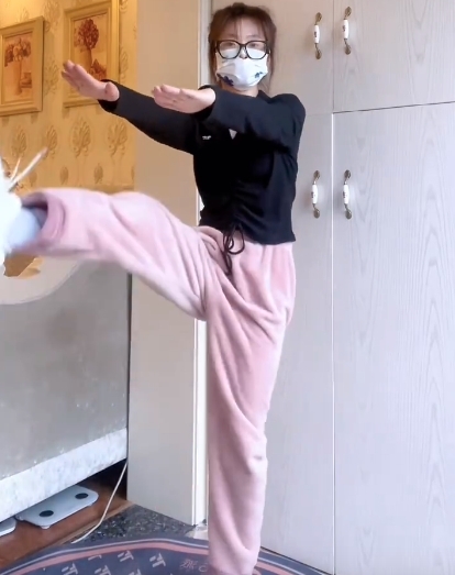第四個動作是前踢腳,先將上半身分挺直,然後向上抬腿時膝蓋要盡量伸直,記得要收腹,臀部肌肉也可以發力幫助平衡。這個動作可以有效瘦下腹部~