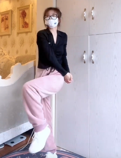 第三個動作類似是踢毽子的動作,不過就用手代替毽子,緊記做動作時要背部挺直收腹,雙腳輸流向內踢,要盡量抬高,動作做40秒就可以。