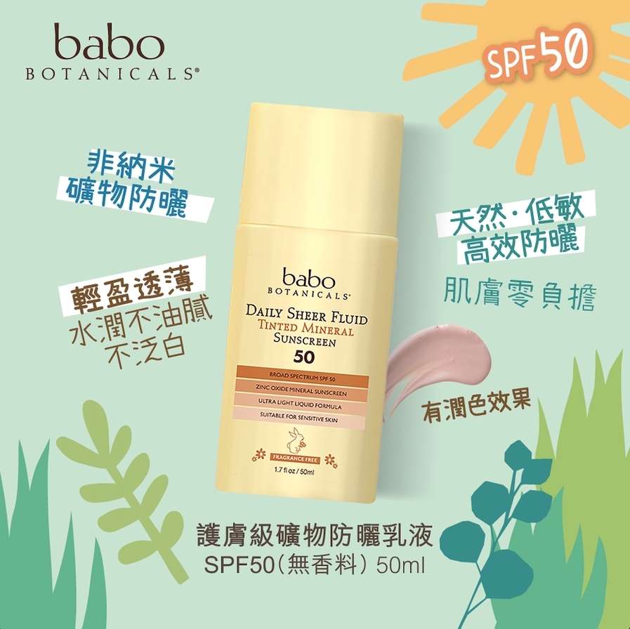 1.Babo Botanicals護膚級礦物防曬乳液 SPF50 (無香料)