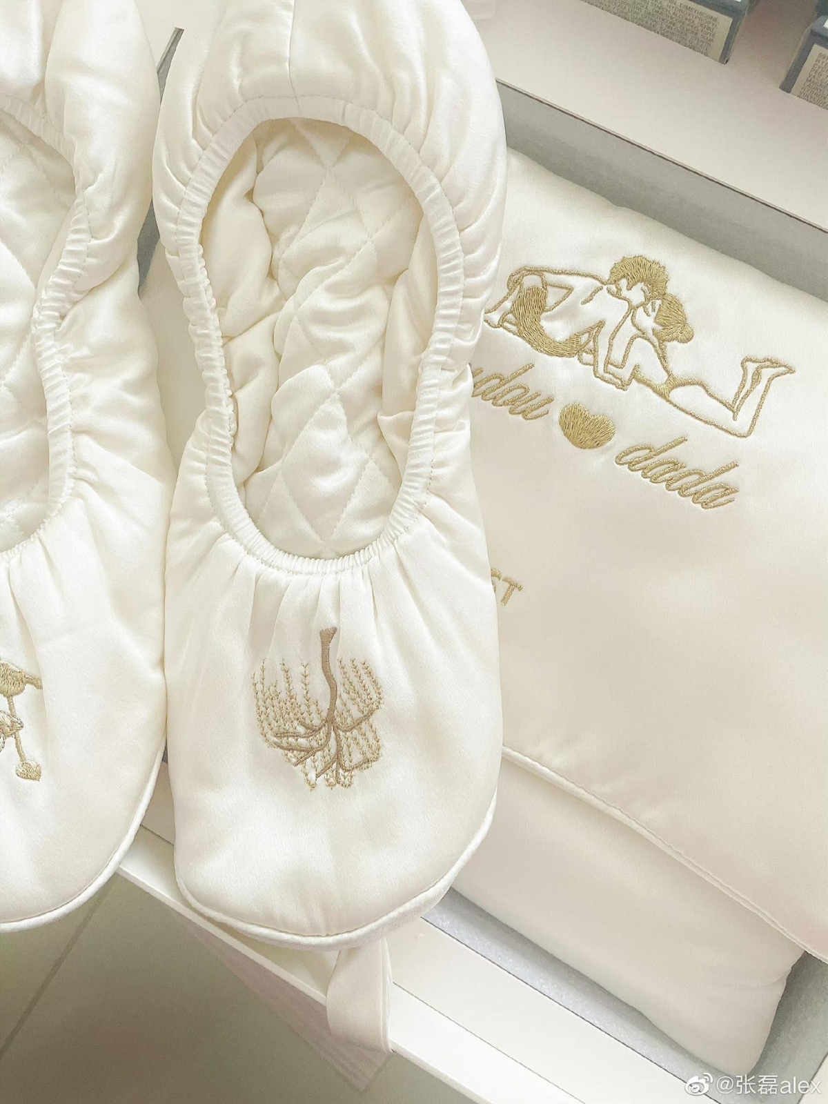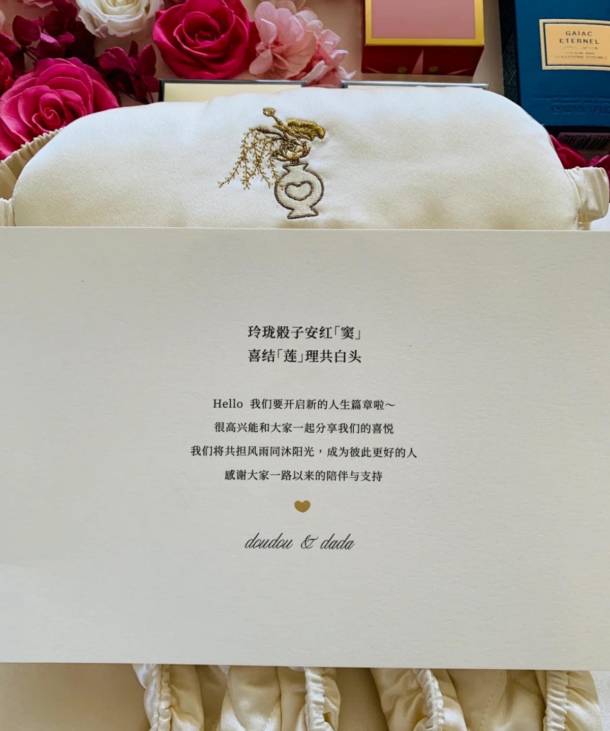 不僅如此,二人的回禮禮物也相當有心思,以白色為主調,配上頂級奢華品牌日霜晚霜、香水及朱古力,而且還貼心為每位賓客訂製絲質眼罩拖鞋,預估價值過5千元。收納袋上還特地畫上二人Q版泳裝親吻公仔並以「DouDou & Dada」自稱超可愛。喜帖上還用2人名字起題,相當有心思,字裡行間都露出濃濃的愛意。而每位賓客也在參加婚禮前都陸續收到禮物~