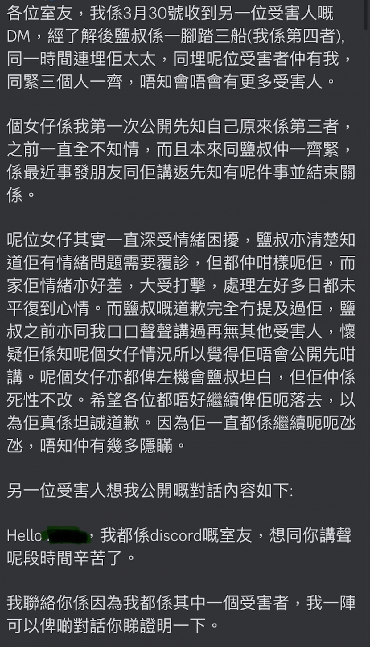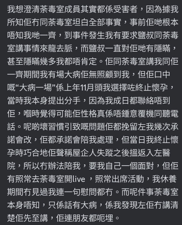 事後鹽叔承認出軌,在「好青年荼毒室」道歉並宣布退出。不過近日再度被爆出,原來出軌對象不止一人!鹽叔疑似一腳踏三船,甚至早前為他墮胎的女粉絲是「第四者」。真正的「第三者」同樣被鹽叔欺騙,以為對方單身。鹽叔更以「保護她」為由,一直隱瞞,結果受害者卻發現更多鹽叔的謊言。