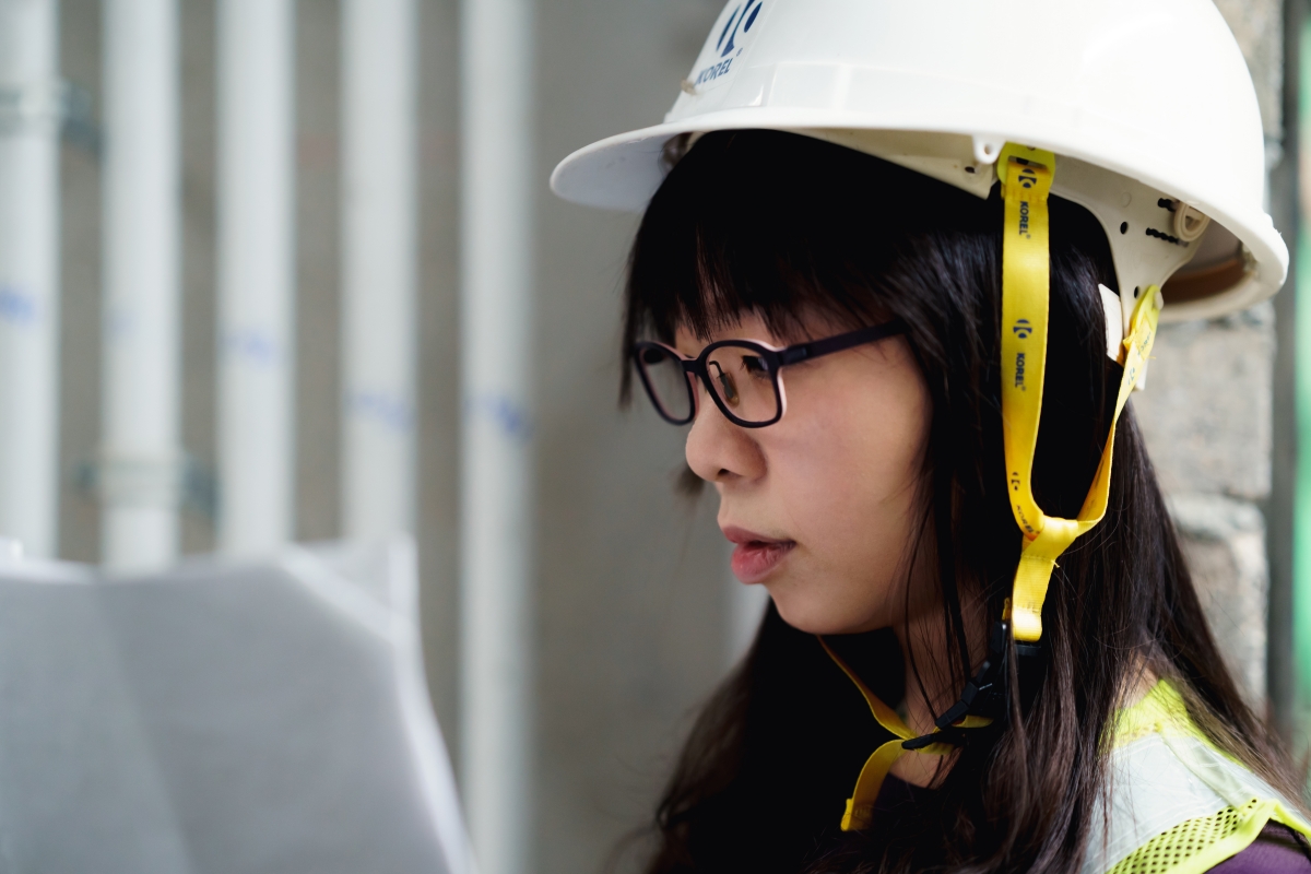 在塵土飛揚,粗口橫飛的地盤裡,Sharon沒有長成「職安女漢子」,反而邁著優雅步姿越過鋼筋泥地,柔韌的個性一樣贏得師傅尊重。