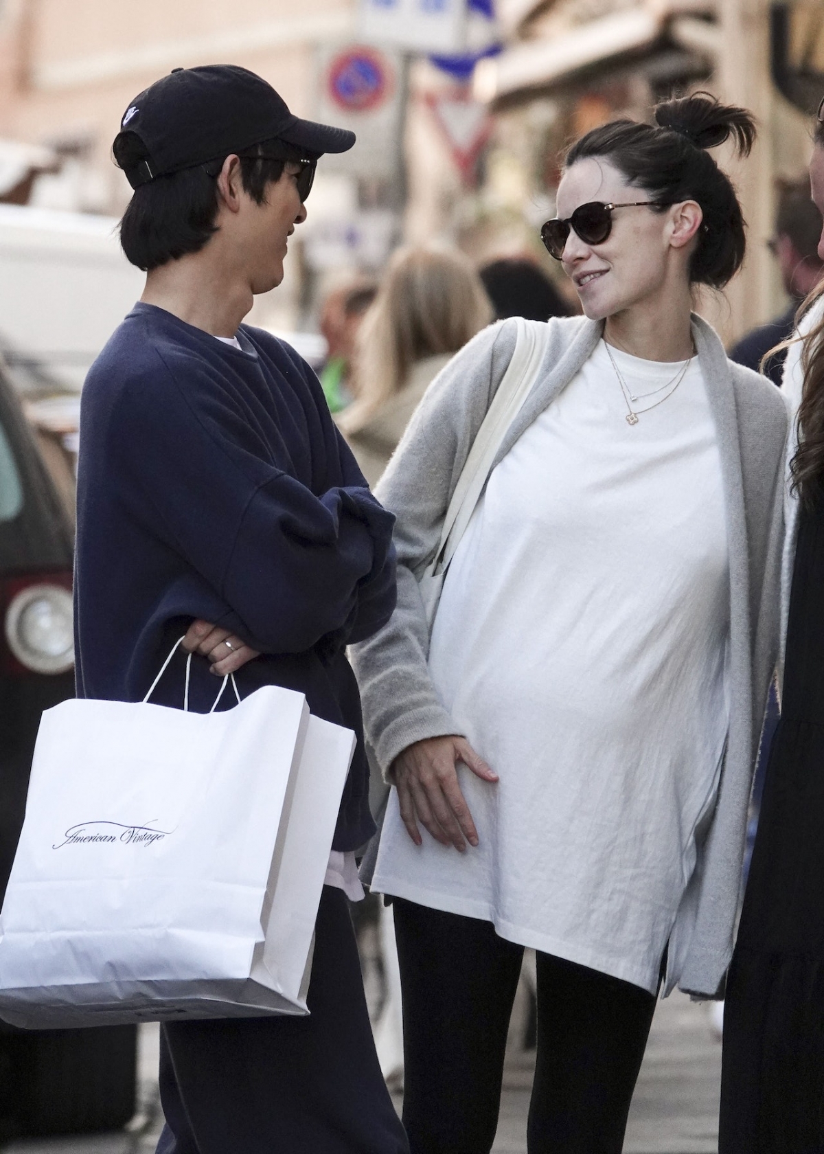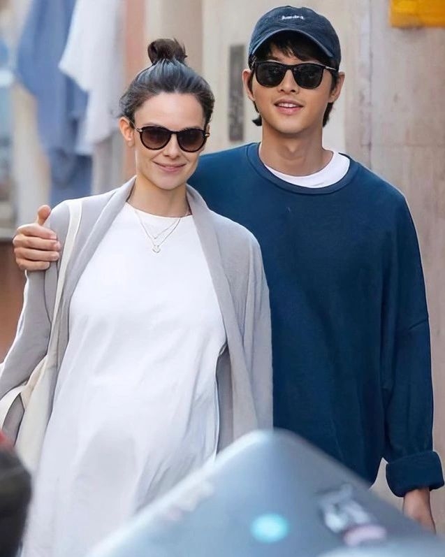 相中可見,妻子Katy穿著白色上衣配上灰色針織衫,下身穿著緊身褲,造型隨性~雖然孕肚明顯但四肢依然十分纖細。一旁的宋仲基穿著海軍藍休閒衛衣,頭戴黑色鴨舌帽;兩人腳踩白色情侶鞋,十指緊扣,沿路有說有笑地逛著街,狀態極佳,感情相當甜蜜!