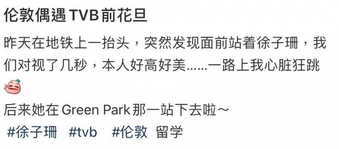 近日有網民在社交網站發文,透露自己日前在倫敦地鐵偶遇徐子珊,甚至與對方對視了幾秒,大讚子珊真人又高又美,子珊穿一身休閑服裝配馬丁靴,綁起頭髮的樣子狀態很好。網民雖然沒有與子珊合照,但貼文吸引了大批子珊的粉絲留言承,都表示很好奇偶像的近況。