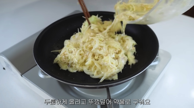 先將白菜、洋蔥刨成條狀,之後放入魷魚、2粒雞蛋及燕麥後攪勻,不過Cho if提到用燕麥代替麵粉會不夠黏力。