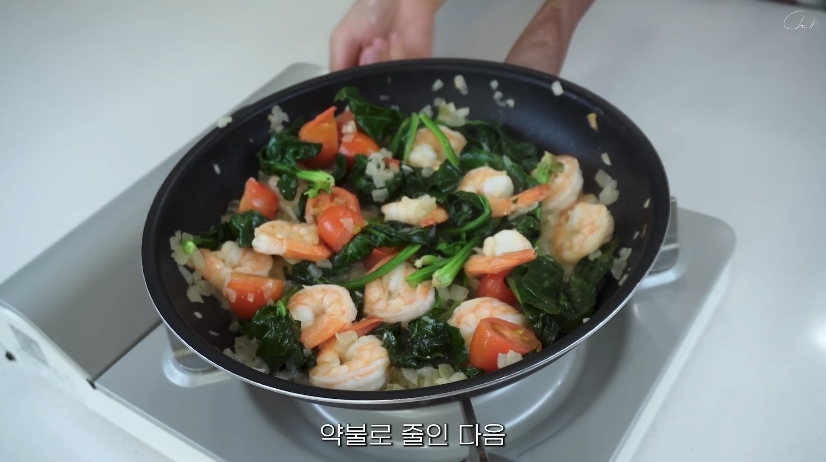 開鍋後先炒香洋蔥再加入大蝦翻炒,看到大蝦邊開始變紅就可以將車厘茄、菠菜下鍋,菠菜開始變軟後就可以轉成小火,再慢慢均勻地倒入蛋漿,最後在表面撒上黑橄欖及芝士碎,最後蓋上鍋蓋煮至雞蛋全熟就可以。