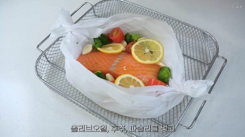 先將洋蔥、薯仔、蕃薯及自己喜歡的蔬菜切成厚厚一片,檸檬、蒜頭及車厘茄都洗淨切好備用;之後先用蔬菜鋪底,再放上一塊三文魚後加上橄欖油、黑胡椒調味,放入氣炸用180度焗15分鐘就完成。