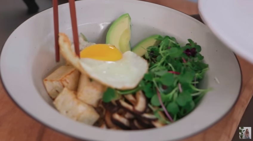 尹恩惠在第二日的早餐就準備了牛油果拌飯,材料分別有豆腐、香菇、雞蛋及牛油果等等,她先將蒟蒻飯鋪到底下,再放上烤好的豆腐、香菇及沙律菜,最後在飯上放上一隻煎好的太陽蛋,拌在一起超好吃。