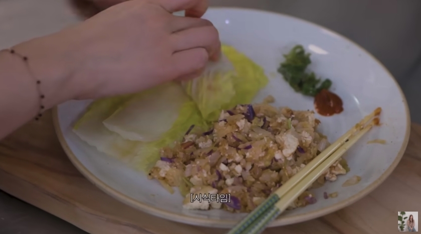午餐她就準備了生酮紫菜包飯,材料分別有雞胸肉香腸、雞蛋、椰菜、吞拿魚及蔬菜等,即使沒有米飯都有飽足感及口感豐富。晚餐方面尹恩惠就準備了簡單的雞胸肉沙拉,又將杏鮑菇切成厚片後去烤,能夠吃出肉的口感。