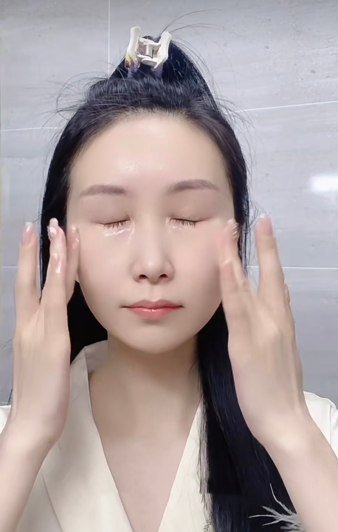 再輕輕輪刮眼下位置,帶到太陽穴。