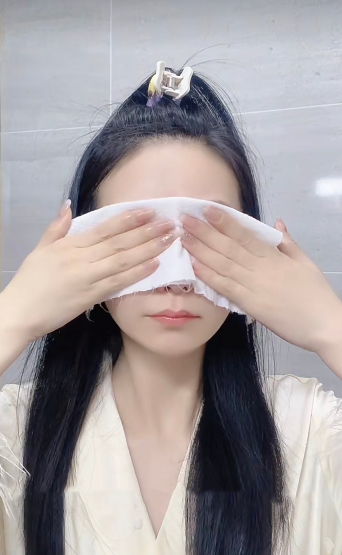 先利用毛巾或化妝棉熱敷整個眼部1分鐘,幫助放鬆眼周和促進血液循環,並有利後續使用的護膚品吸收更佳!