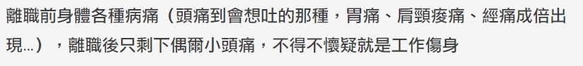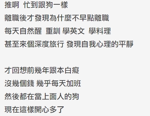 貼文貼出後即刻引起許多網友的共鳴,不少網友都認同,大家對自己「不得不工作」抱持相同的無奈:「離職後才發現為什麼不早點離職,每天自然醒,重訓、學英文、學料理,甚至來個深度旅行,發現自我心理的平靜」、「離職前身體各種病痛,離職後只剩下偶爾小頭痛,不得不懷疑就是工作傷身」