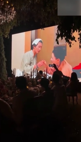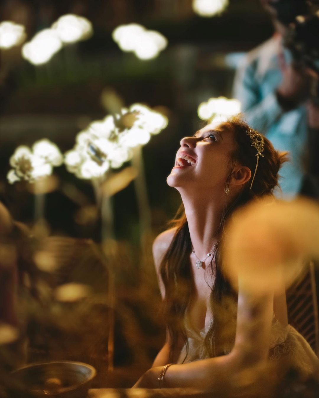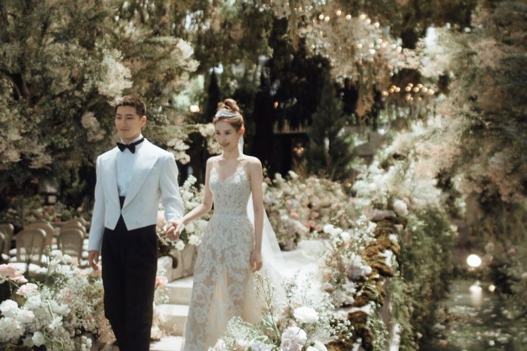 從當中婚禮照片中可見,婚禮場地搭建了玻璃天幕,草種滿一棵棵綠色大樹,上方亦垂吊了過百束綠色植物,以白色及粉紅色鮮花作點綴,整個場地都讓人置身童話世界一樣,非常夢幻,相信是每個女生都夢寐以求的婚禮