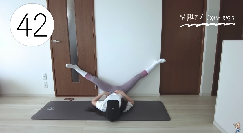 第三個動作是開合腳,先平躺在瑜珈墊上,然後將雙腿伸直在空中,再向兩側打開,一共開合30次。